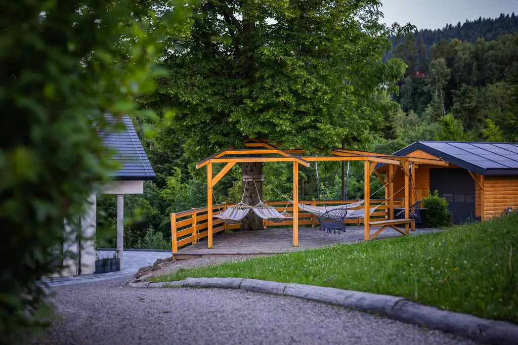Dodatkową atrakcją jest piec chlebowy oraz duży tradycyjny grill, które mogą być wykorzystywane do wypieku domowej pizzy czy pieczenia mięsa, dodając spotkaniom niepowtarzalnego klimatu i aromatycznych doznań.
